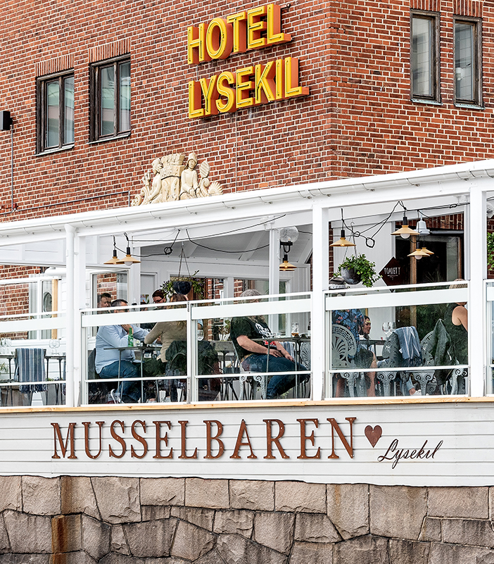 As the mussel bar we try to keep a blue thread in what we do and in what we serve, but at the same time there are essential differences in our three restaurants. Partly because they are situated in their own very unique places and partly because we want to show you the different sides that there can be to the same thing, adding whatever we believe to fit in that certain place. Ljungskile, as the original with the old bell tower and our boat Märta. Smögen, all the way out on Kleven where we have established ourselves in a newly built restaurant with a fantastic view of the whole pier of Smögen. And now Lysekil, where we have been able to build our bar on ground of ancient lineage and one of Bohuslän’s biggest entertainment places of the past, Hotel Lysekil. The Mussel bar itself with kitchen and restaurant is built on the terrace so you as our guests can sit close enough to the kitchen and to our personal.